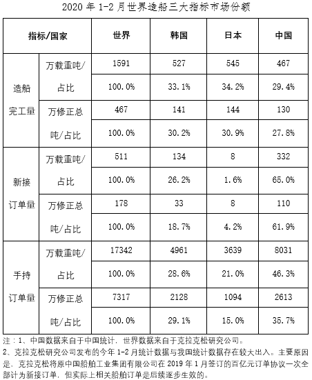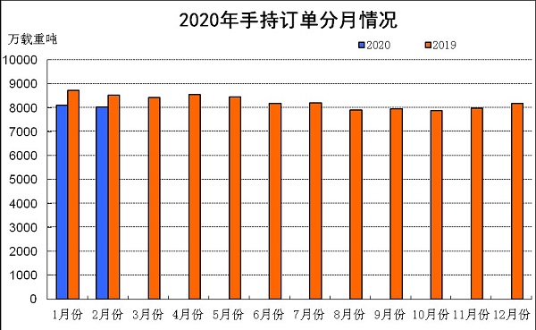 2020年1~2月份,受新冠肺炎疫情爆发的影响,国际航运市场震荡下行,全球新船订单量大幅减少。我国造船完工量和手持船舶订单量同比下降,受去年同期基数较低的影响,我国新承接船舶订单同比增长。重点监测企业工业总产值等主要经济指标同比下降。