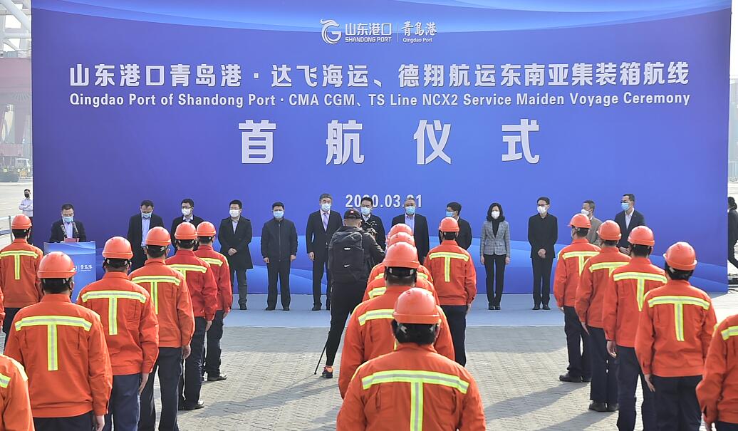 3月21日下午,在山东港口青岛港前湾集装箱码头81泊位,随着德翔航运“克丽缇娜”轮汽笛鸣响,山东港口青岛港・达飞海运、德翔航运东南亚集装箱航线正式首航,这是青岛港今年新开通的首条国际航线,也是青岛港的第171条集装箱航线。