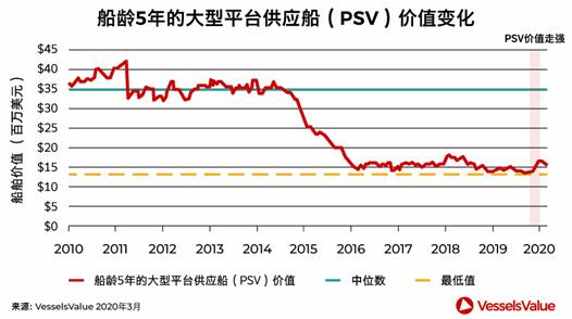 从下图中我们可以看到,2019年底PSV的价值明显走强,市场价值已逐步脱离了该类船型的历史低位水平。因此对于希望抄底低价资产实现获利的公司而言,他们可能需要支付比去年略高的价格。