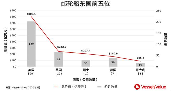 美国公司所拥有的邮轮数占全球邮轮船队总规模的43%,价值占全球邮轮价值的48%。