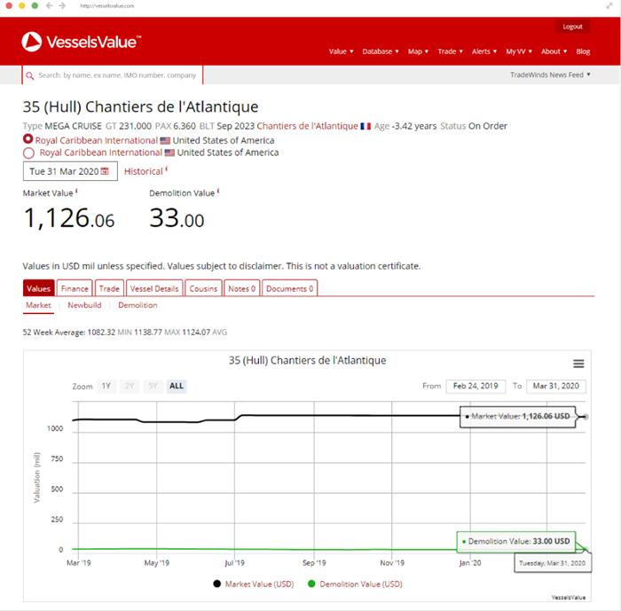 皇家加勒比国际公司于去年2月以11亿欧元的价格订购,之后船舶价值有所上涨,直至受COVID-19影响价值开始下滑。
