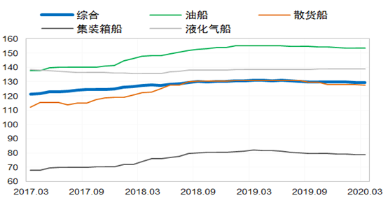 2020年一季度,由于新船订单稀缺,行业竞争加剧,对新船价格下拉作用显著。截至3月份,克拉克森新船价格指数129.4点,同比下滑1.6点,较年初下滑0.6点,环比上浮0.2点;新造船价格中国指数收于1111点,同比下滑15点,较年初下滑4点,环比下浮1点。主力船型新船价格略有波动,其中集装箱船的新造船价格中国指数为848点,环比松动4点,较年初下滑8点;散货船和油船的新造船价格中国指数为1352点和1198点,虽环比均持平,但较年初分别下滑6点和2点;相比之下,液化气船价格较为坚挺,其新造船价格中国指数为1391点,环比提升2点,较年初提升4点。从典型船型新船价格看,一季度中小型散货船、支线型集装箱船的新船价格环比小幅松动25万美元,VLGC的新船价格微涨50万美元,其他船型价格保持平稳。