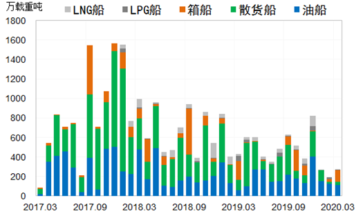 油船方面,1-3月,全球成交新船35艘、389.8万载重吨,同比减少27.5%,具体订单包括3艘VLCC、10艘苏伊士型原油船、2艘阿芙拉型原油船(穿梭油轮)、3艘LR2型成品油船、8艘MR型成品油船以及8艘小型油船。