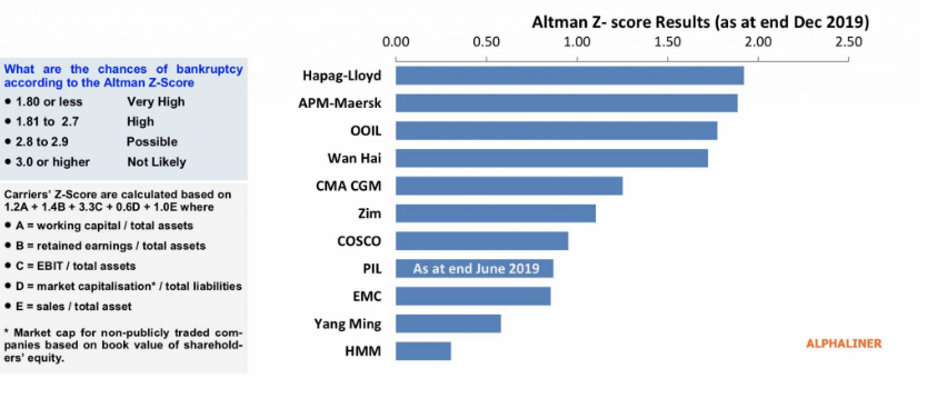 Altman Z评分在1.72至1.92之间的有赫伯罗特、马士基、东方海外和万海航运,存在破产风险;