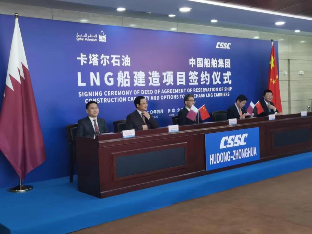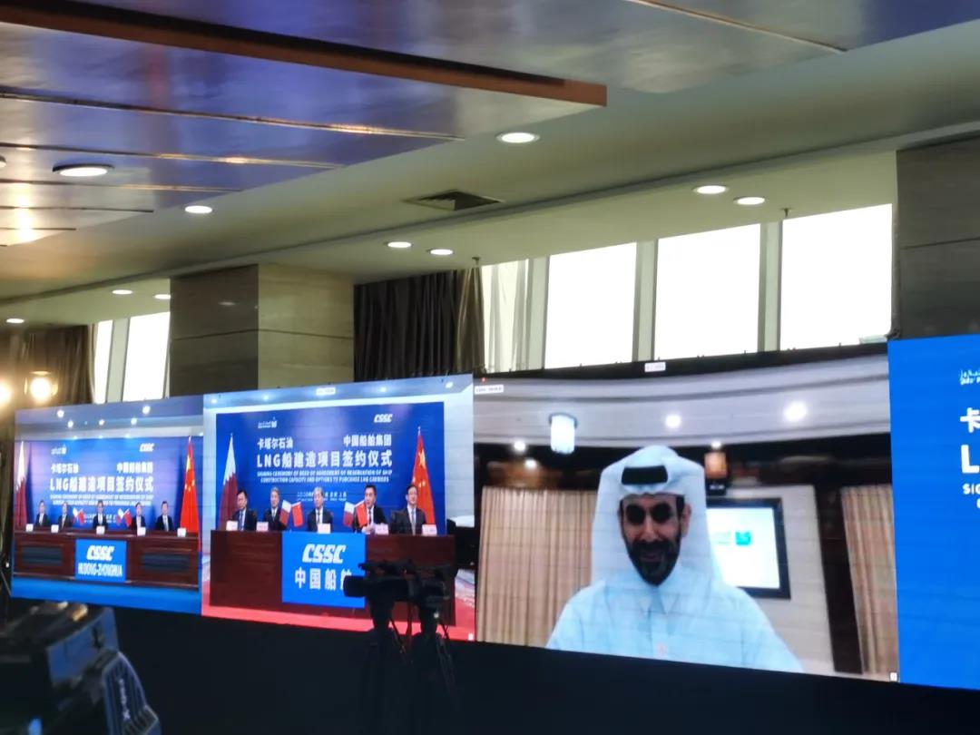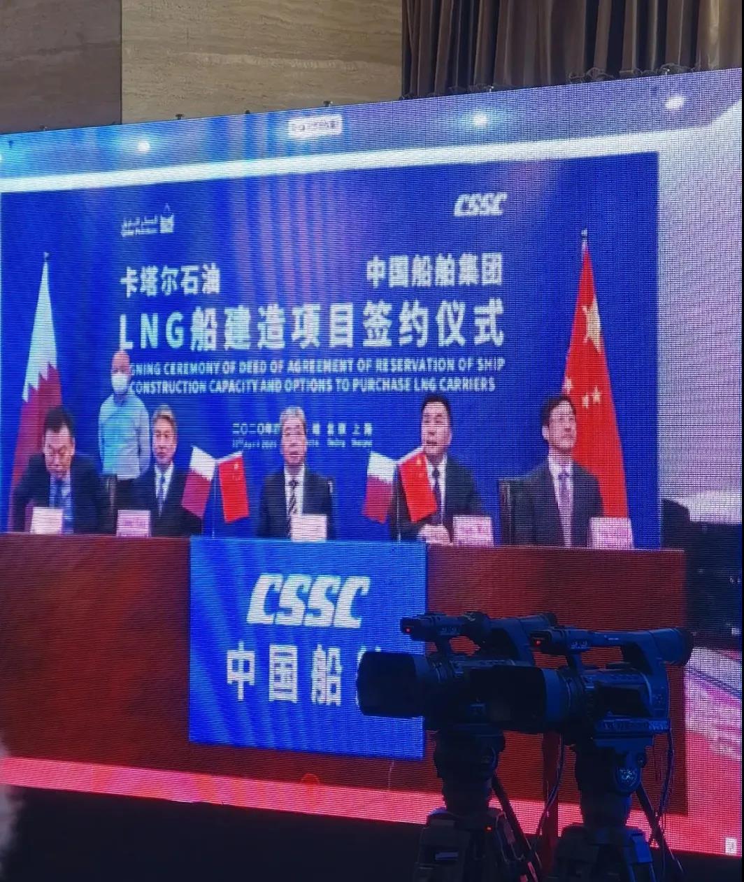 北京时间4月22日下午,中国船舶集团有限公司与卡塔尔石油公司(Qatar Petroleum,QP)通过视频连线,分别在卡塔尔多哈,中国北京、上海三地举行“卡塔尔石油―中国船舶集团LNG船建造项目”签约仪式。