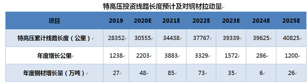 根据国家电网数据,每公里特高压需要220吨的钢管需求,十四五期间特高压线路将增长12473公里,需要钢材增量为273万吨,年均增长54.6万吨。
