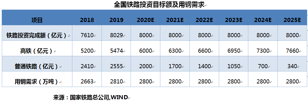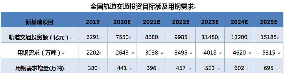 按照建筑业内预估,1亿元铁路或交通轨道投资需要消耗钢材0.35万吨,每年铁路投资的用钢需求基本稳定在2800万吨左右。2020年,轨道交通用钢需求将增长395万吨,十四五规划期间将以年均535万吨的用钢需求量增长。