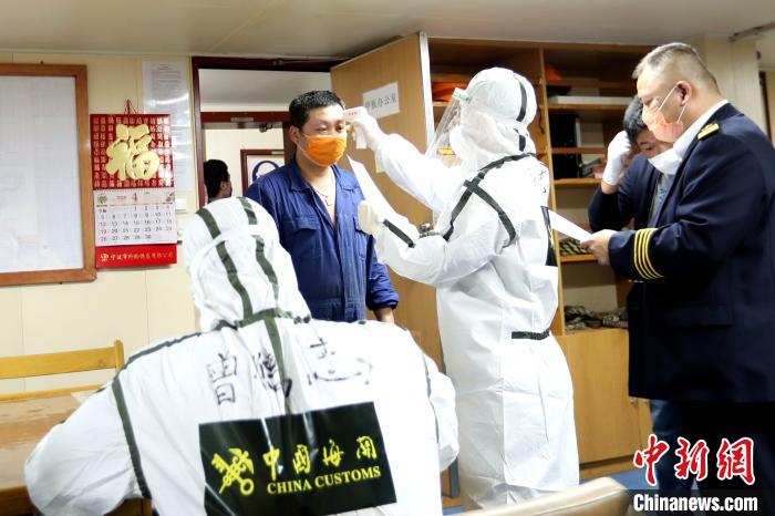 4月12日,香港驶抵广州南沙新港二期码头的“新常熟”号有4名中国籍船员申请离船。11时,3名身着防护装备的卫生检疫组、专业处置组海关关员背着“检疫包”、拎着“送检箱”,对船员健康情况、食品饮用水卫生、环境卫生、病媒生物防制和船上废弃物管理进行全面检查。