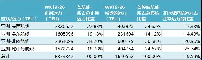 第19到26周,停航导致的运力减少比重约为19.6%。从正常运力情况来看,各船公司在亚洲-北欧航线投入的运力最多,其次是美西航线。同时北欧航线停航比重在四个航次中也是最高的,其次是地中海航线。