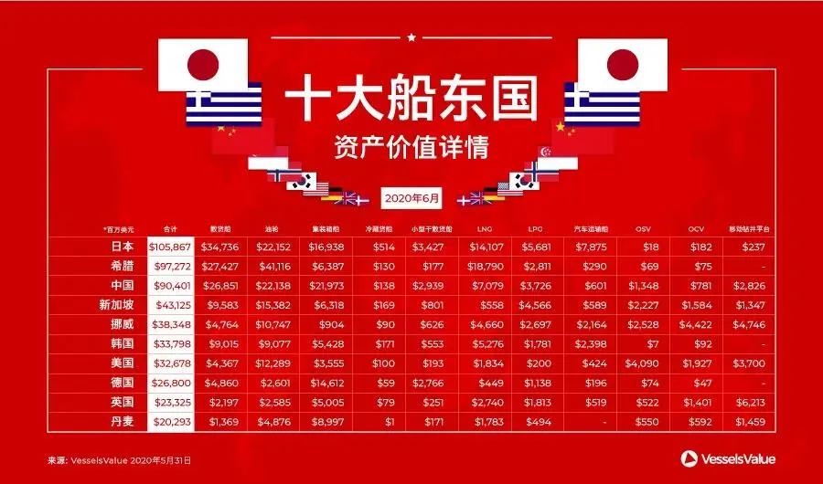 日本的船队总价值尽管相比于2019年减少了120亿美元,但其仍然是全球拥有船舶总价值最高的船东国。