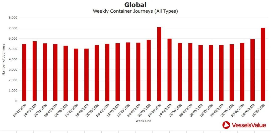 上半年,航次量最多的一周,出现在4月上旬,达到7093个。不过,在船公司陆续恢复部分航次后,6月份的航次量已开始明显增多。