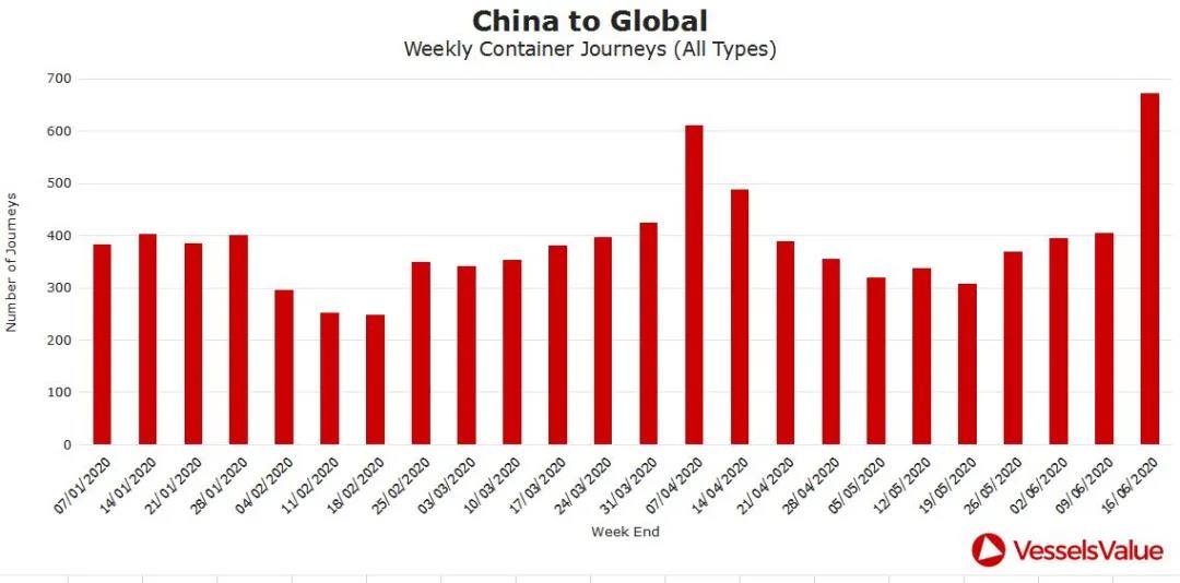 不过,从4月中旬开始,市场又迎来了新一轮低谷,并持续到6月初。但6月16日的一周,从中国出发至全球各地的航次量,开始明显回升,达到673个,创今年以来最高。
