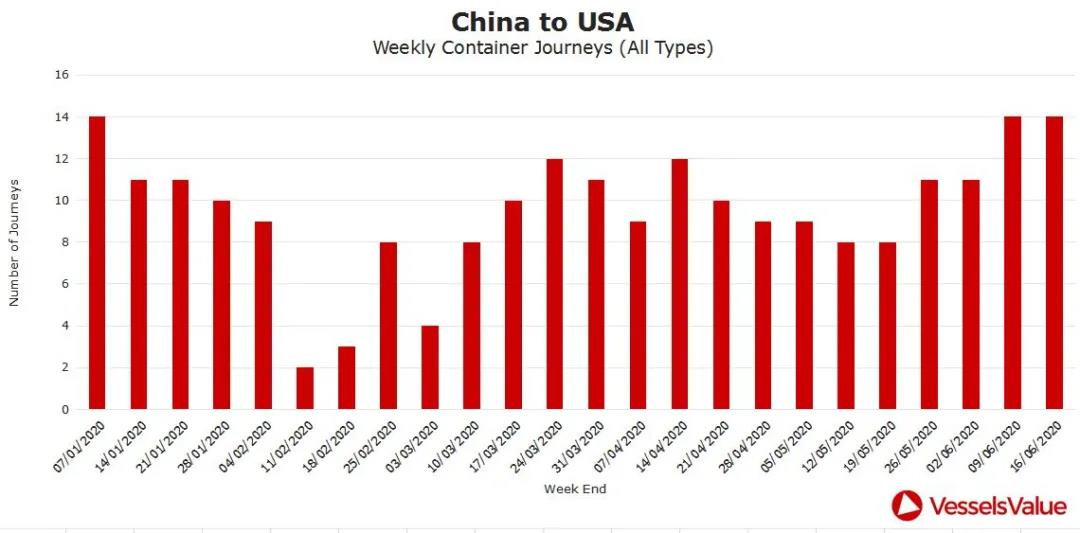 上半年,中国至美国集运市场走出一波过山车行情。在2月11日的一周,甚至只有两个航次。但5月下旬以来,随着美国逐步放宽封锁措施,中国至美国的航次量也迅速回升,与今年年初几乎持平。