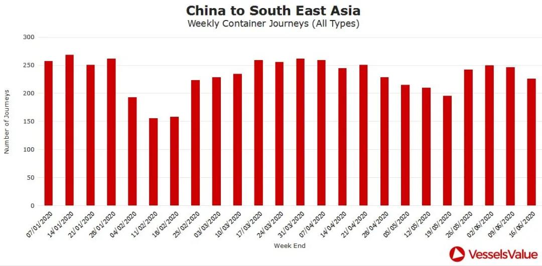 总体来看,上半年,中国到东南亚地区的航次量保持稳定,仅在2月中旬出现了较大波动,但很快航次量就恢复正常。