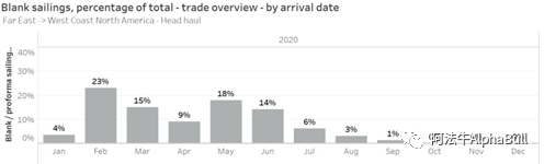 eeSea.com的数据显示,在亚洲-美国西海岸航线,第二季度因航次取消减少的运力占原来配置总运力的12.7%,但到目前为止,班轮公司公布的第三季度取消的航次运力占比仅为3.3%(7月为6%,8月为3%,9月为1%)。