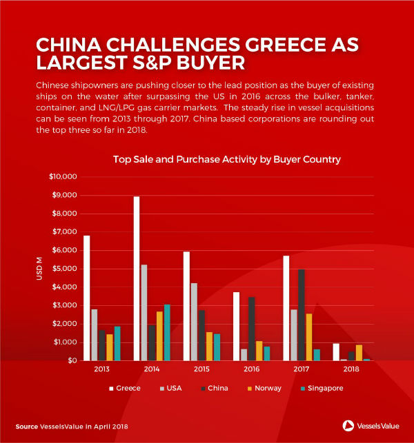 VesselsValue认为,随着中国船东积极收购散货船、油船、集装箱船、LNG船以及LPG船,中国将有望超越希腊成为全球最大的船舶买卖方。
