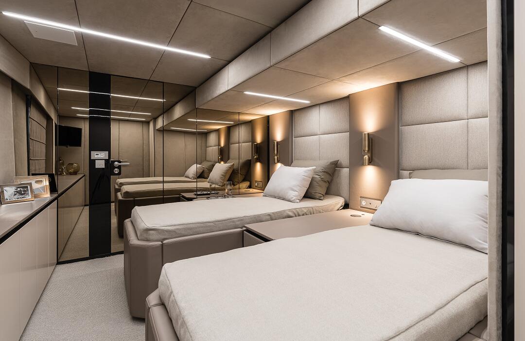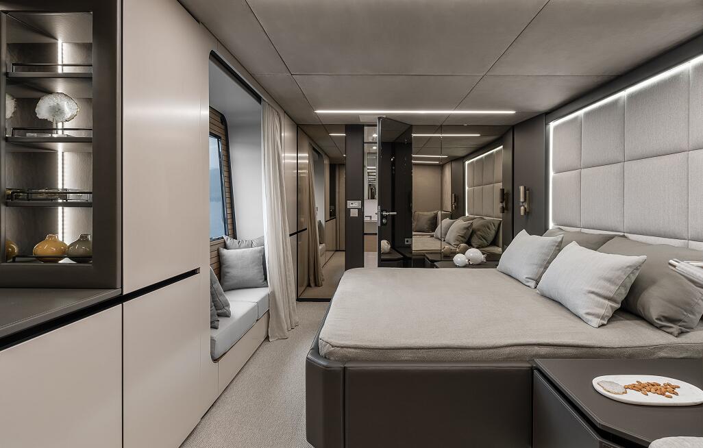 主人套房拥有非常奢侈的空间,安置有一个步入式的换衣间,一套沙发,在双人床上方,有一台安装在天花板上的可折叠电视机,以及一个翻转出船体的私人阳台。在左舷的船体内,拥有2间宽敞的客人房和厨房。