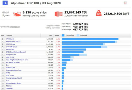 全球20大班轮公司运力排行榜