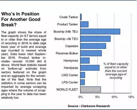 当然,如果拆解船的平均年龄下降,图表将会再次调整。在3000-6000TEU的集装箱市场,船龄最短的仅为10年,50%的船舶大概在这个船龄或较大船龄。