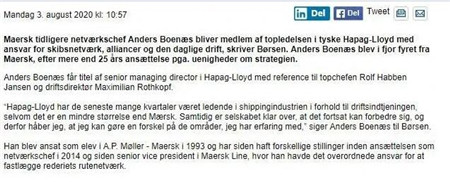 据丹麦航运媒体报道,原马士基航运高级副总裁Anders Boen?s,将加盟马士基的竞争对手――德国航运企业赫伯罗特,担任高级董事总经理(senior managing director)一职,负责赫伯罗特的航线网络及联盟的日常运营。