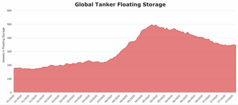 油轮市场的表现也是非常惹人注目。今年开年以来精彩不断,油轮租金在4月份达到了历史高点。4月份之前的一系列事件促使了油价暴跌,原油供过于求。再加上由于新冠疫情导致的需求减少,以及陆上储存空间的持续下降,导致转作浮动油舱的成品油轮和原油油轮的数量创下历史新高。