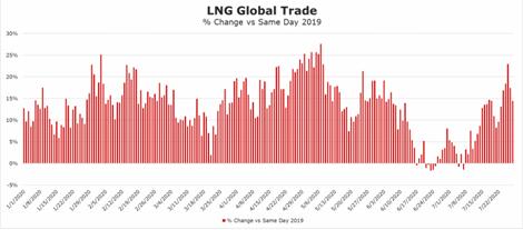 液化天然气领域的货量海里虽在2月底因亚洲各大进口市场的需求疲软而略有下降,但总体仍保持在2019年水平之上。 每日货量海里数据显示,今年迄今只有8天低于去年同期。
