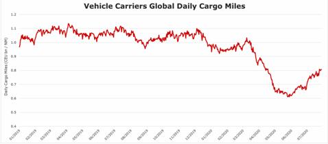 今年,汽车运输船市场受到了新冠疫情的沉重打击,许多从东半球出发的主要航线陷入完全停滞。比较这两年的货量海里可以看出,今年的货量海里水平持续低于去年同期,下降了惊人的40%。