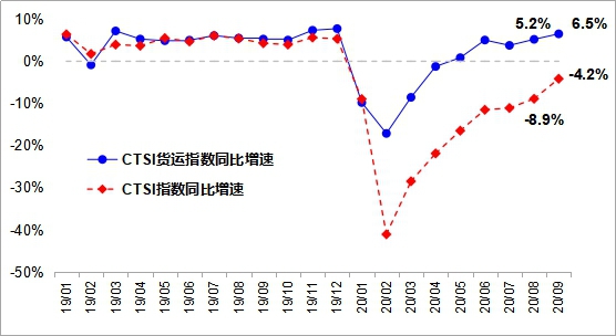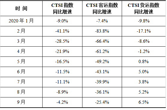 2020年9月,中国运输生产指数(CTSI)为168.4点,同比下降4.2%,降幅较8月收窄4.7个百分点。分结构看,CTSI货运指数为192.7点,同比增长6.5%,增速较8月加快1.3个百分点;CTSI客运指数为124.1点,同比下降25.4%,降幅较8月收窄10.5个百分点。