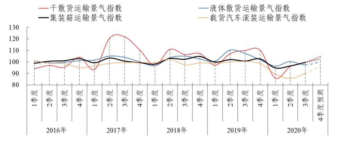 图5 干散货、液体散货、集装箱、滚装运输景气指数走势图