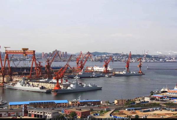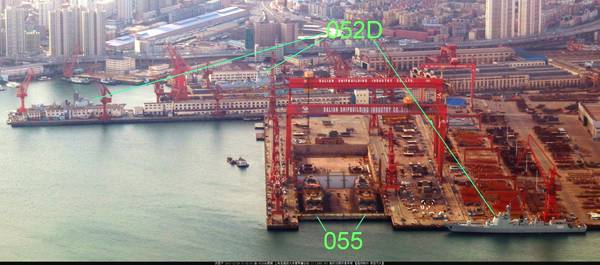 作为中国规模最大、资格最老的军用造船厂,大连造船厂良好的硬件设施为这种独特的并驾齐驱式建造方法提供了便利,建造055型驱逐舰和未下水的改进型052D型驱逐舰的船坞是老厂区400m×96m×13m的30万吨船坞,足够大的船坞宽度,可以让两艘055这样的12000吨级的驱逐舰进坞搭建,而国外哪怕是美国著名的巴斯钢铁这样的造船厂,都缺乏这么巨大的船坞。