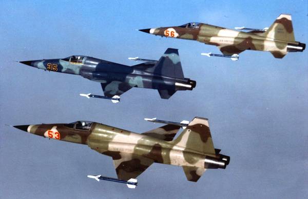 冷战中,米格-21“鱼窝”和F-5“自由战士/虎”式是东西方两大阵营盟友们最常见的轻型战斗机,作为二代机中两种针锋相对的轻型战斗机,“鱼窝”和“虎”一个高速性能好、一个低空缠斗强,在越南战场上恶斗,在欧洲战场上对峙,不过比起苏军自己也大批订购的“鱼窝”,“虎”式战斗机除了美军假想敌部队少量采购外,主要是军援用途。