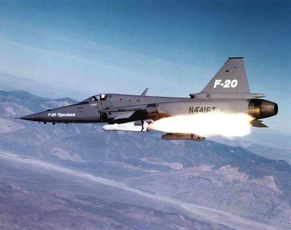 在大洋彼岸的美国,F-5战斗机家族的“娘家”——诺斯罗普考虑其换代机型的时间更早,在“虎”式战斗机基础上研制的F-20“虎鲨”在1982年就实现了首飞,在整体构型改动不大的情况下,它用1台先进的F404中推涡扇发动机取代了2台J85涡喷,APG-67型脉冲多普勒机载雷达在当时很先进,让其比F-16还更早具备使用AIM-7“麻雀”中距空空导弹的能力,F-20可以使用当时美制所有的机载对空、对地武器。