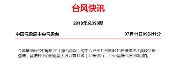 11日上午9时10分,今年第8号台风“玛莉亚”(强台风级)的中心在福建连江黄岐半岛登陆,登陆时中心附近最大风力有14级(42米/秒),中心最低气压960百帕。