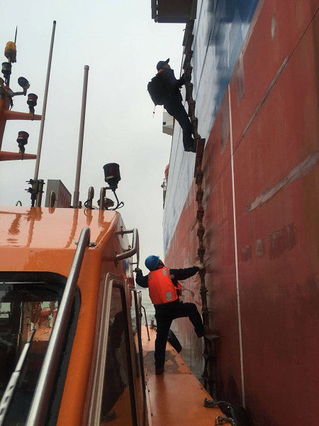 图说:引航员熟练地爬上船舶为其引航上海港引航站供图(下同)