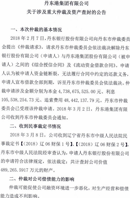 此前,丹东港曾在3月6日发布公告表示,丹东银行向丹东市仲裁委员会提出《仲裁请求》,请求丹东市仲裁委员会依法裁决解除丹东银行同丹东港之间的《综合授信合同》及《流动资金借款合同》。