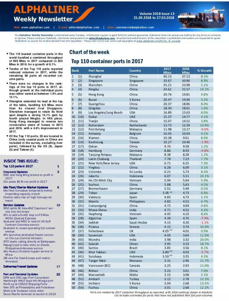 知名航运分析机构Alphainer日前发布了2017年全球110大集装箱港口数据。与2016年相比,2017年前十位港口排名并未出现变化。