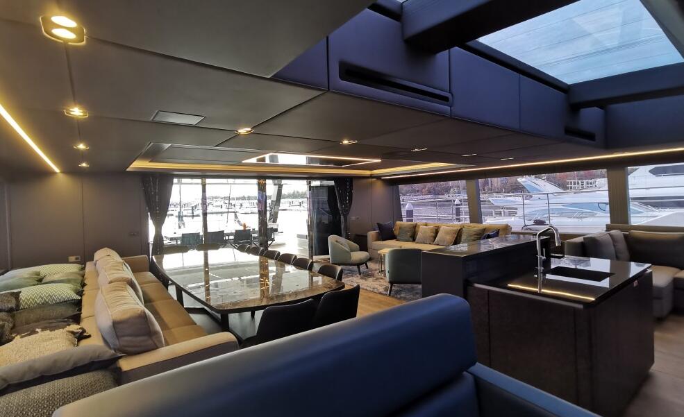 在主甲板层的沙龙区域,左舷一个大号沙发和船艏的小阅读区共同打造了一个非常轻松舒适的区域。右舷的大型餐桌可以容纳12人位,宾客们可以在这里尽情享受美食。在通往前甲板平台的舱门处,还有一个设备齐全的吧台。