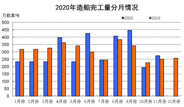 2020年1~11月份,我国造船完工量降幅进一步收窄,新船订单和手持船舶订单量下降,重点监测企业主营业务收入增长,工业总产值等指标同比下降。