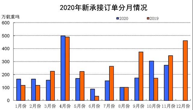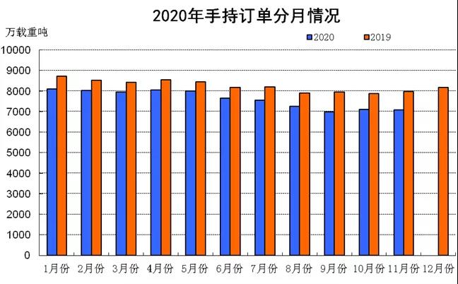 1~11月份,全国造船完工3324万载重吨,同比下降2.6%。承接新船订单2252万载重吨,同比下降8.7%。11月底,手持船舶订单7094万载重吨,同比下降11.1%,比2019年底下降13.1%。