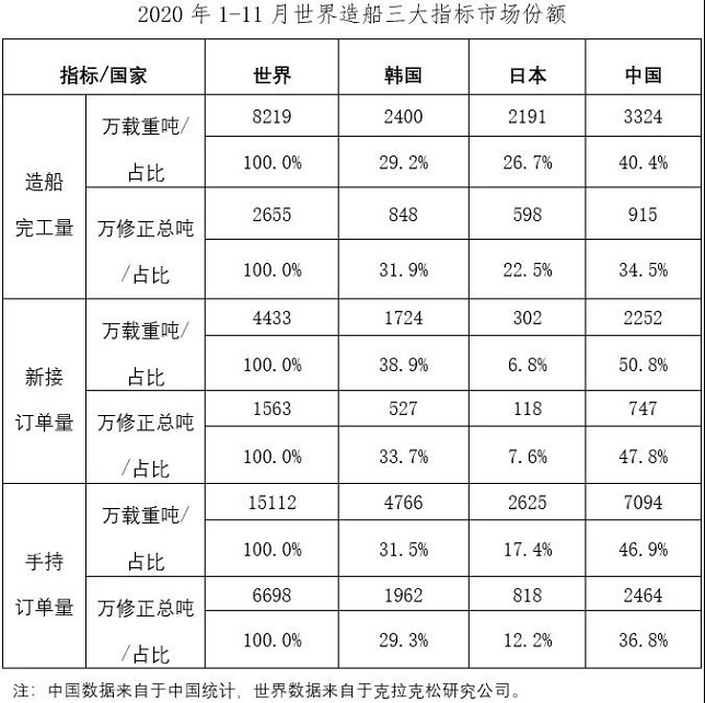 1~11月,我国造船完工量、新接订单量、手持订单量分别占世界市场份额的40.4%、50.8%和46.9%。