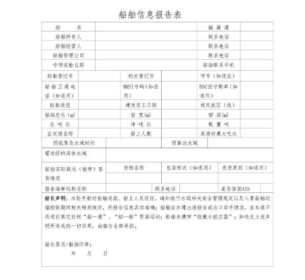 拟驶往青岛管控水域航行、停泊或作业的外国籍船舶,应在办理出口岸查验手续时提交《船舶信息报告表》、船上人员名单和船舶保安专项检查报告(PSC检查报告)复印件。