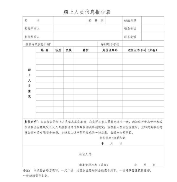 拟驶往青岛管控水域航行、停泊或作业的中国籍船舶,应在办理船舶出港报告时向海事机构出示加盖船舶安全检查专用章的《船舶专项安全检查项目表》《船上人员信息报告表》,同时报送经船长签字确认的《船舶信息报告表》《船上人员信息报告表》。