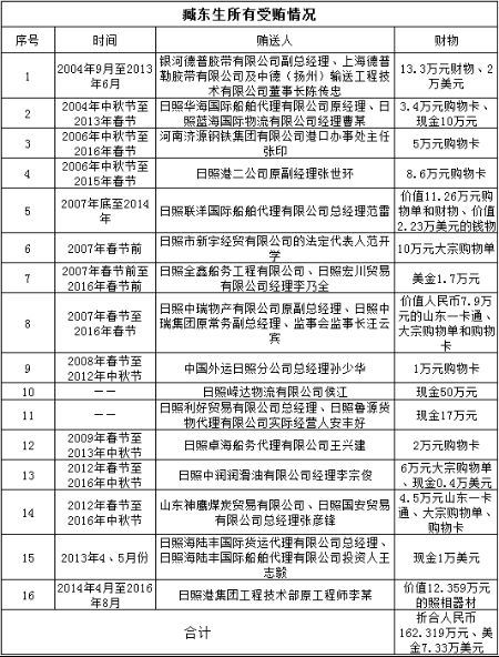2004年9月至2016年中秋节,臧东生在担任日照港陆桥机修公司经理、日照港二公司经理(含兼任)、日照港集团副总经理期间,利用职务便利,收受银河德普胶带有限公司总经理陈传忠、河南济源钢铁集团有限公司港口办事处主任张印等多个单位及个人所送现金84.2万元,大宗购物单、购物卡和山东一卡通51.4万元,美金7.1万美元,另有手表、地毯、灯具等折合人民币26.719万元和西装一套价值0.23万美元,共计折合人民币162.319万元、美金7.33万美元,并为其谋取利益。
