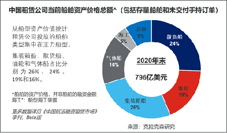 克拉克森研究估算当前全球航运(除海工)船队和手持订单价值为11,544亿美元。据统计中国国内共有28家从事国际船舶融资租赁业务的公司和50家仅从事国内船舶租赁业务的公司,拥有船队资产价值总额达796亿美元,合计约1.1亿总吨,2291艘船;资产总量仅次于第三大船东国日本(合计总船队规模1080亿美元,1.8亿总吨)。以资产价值计,前十大头部租赁公司市场份额占比高达84%。
