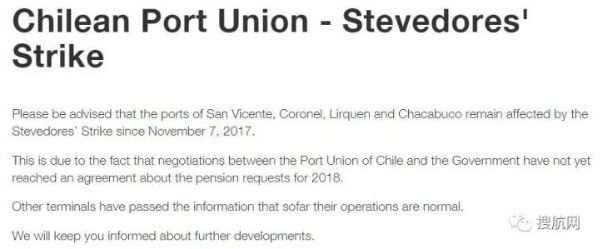 日前,赫伯罗特发布通知,由于智利港口联盟未能与政府就2018年养老金要求达成协议,自2017年11月7日起,圣维森特港(San Vicente)、科罗内尔(Coronel)、利尔奎(Lirquen)、查卡布科港(chacabuco)四大港口宣布进行罢工。