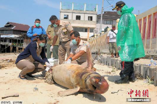 当地时间2018年4月2日,印尼巴厘巴板附近海域发生石油泄漏事故,海豚中毒变色继而死亡。