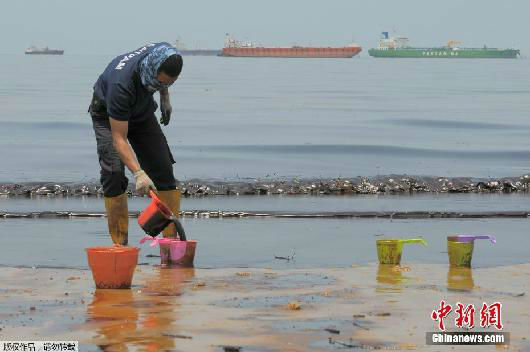 警察在Banua Patra海滩清理浮油。