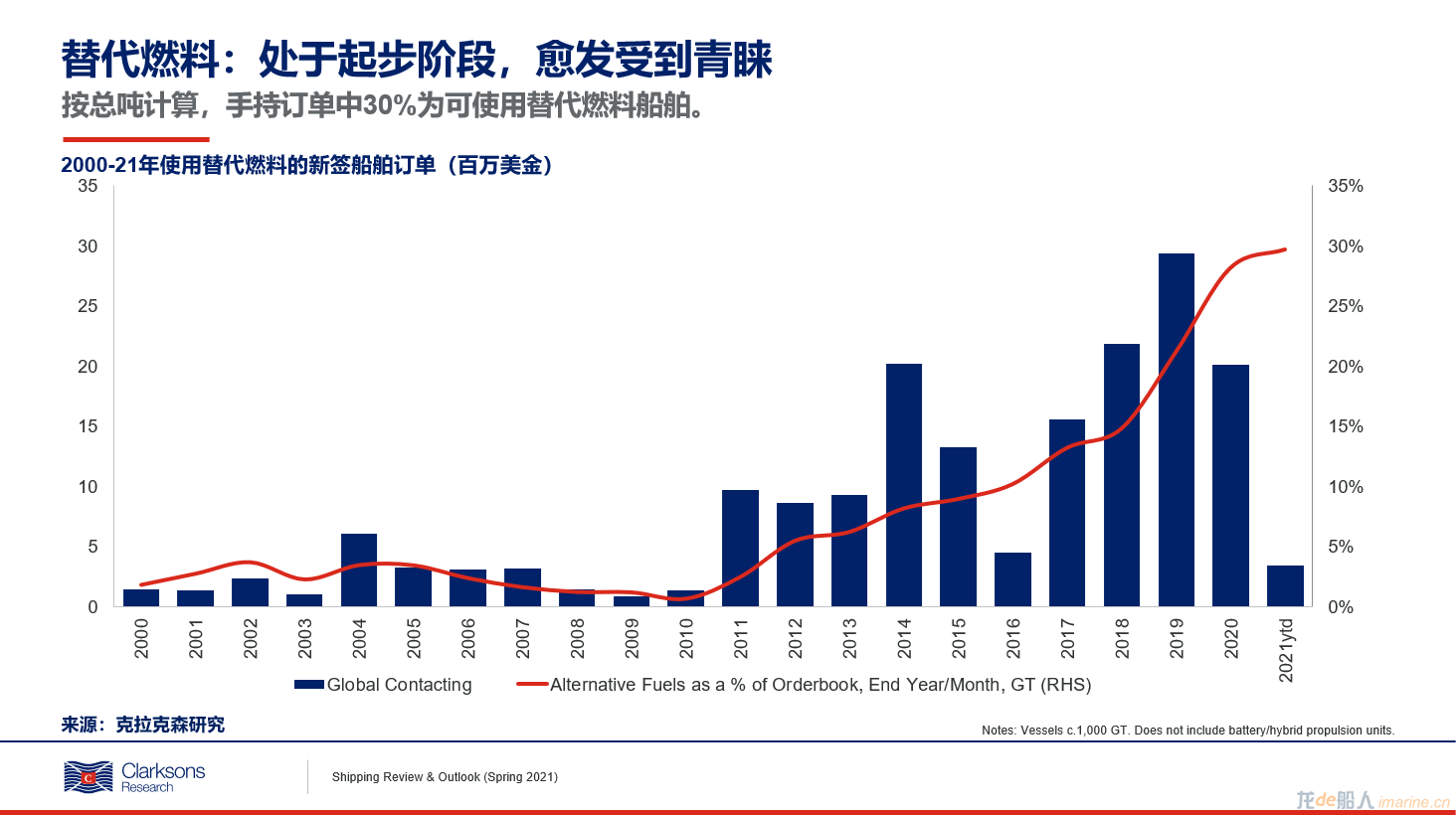 2020年航运业排放约8.1亿吨二氧化碳,占全球二氧化碳总排放量2.4%。努力减少碳排放量仍然是航运业各方所需面对的核心问题。行业监管和政策框架形成正逐步加速,燃料转换目前处于早期阶段,但替代燃料越来越受青睐。按总吨计算,手持订单中30%为可使用替代燃料船舶。按载重吨计算,目前船队中26%运力为 环保型船舶, 21%运力安装了脱硫设备,并且节能技术正越来越受欢迎。