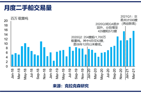 2020年受到疫情影响,二手船交易量一度跌至历史低位。而后随着市场找到疫情下完成二手交易的解决方法,前期积压的买卖需求开始释放。在该因素和市场情绪改善的共同作用下,2020年下半年二手船交易活动恢复强劲,四季度交易量无论是以数量计还是载重吨计均创下新高。2020年二手船交易总量达到创纪录的1.02亿载重吨,比2019年增长了29%。