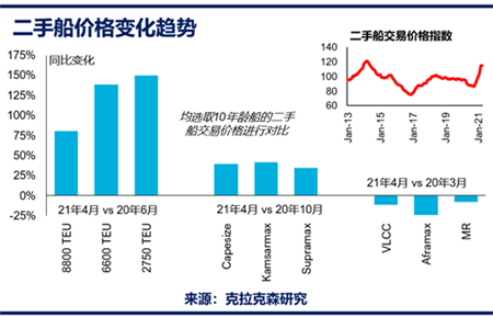 我们从克拉克森研究分船型(标准船型,代表性船厂)统计数据来看,二手集装箱船价格指数自20年6月以来上涨了47%;二手散货船价格指数自20年10月起上涨31%;二手油轮价格指数较20年3月低11%。值得注意的是资产价格的波动并非与运费市场波动完全一致,以油轮为例,克拉克森油轮运费指数在2月中降至最低点,同期克拉克森二手油轮价格指数自2月开始持续增长,这一定程度上受到了整体资产价格(包括新船价格)上涨趋势的推动以及投资者乐观情绪的影响。
